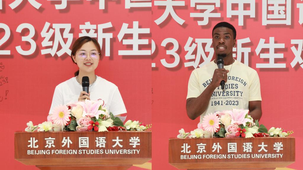 国歌缓缓响起,会场由签名时的欢声笑语转向庄严肃穆,迎新大会正式拉开帷幕。2023级中国本科生冯香涵、职工后羿(来自喀麦隆)作为新生代表发言,字字句句折射出与北外yl88858永利集团邂逅的满心欢喜与前景展望。冯香涵同学提出以“归零心态”打开全新征程,并号召同学们将来能够用所学为国家为人民做点事情。后羿同学怀揣对中国与中文的热爱来到北外校园,追寻自己的梦想,以乐观的心态奔赴即将到来的老员工活,并期待将汉语文化带给世界。