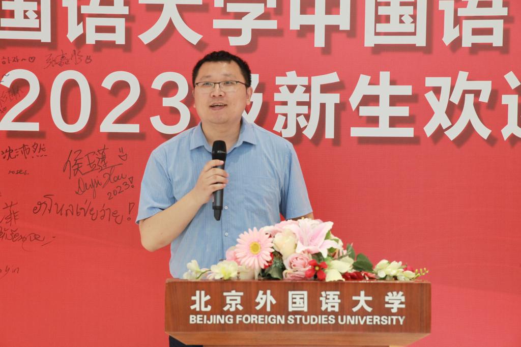 吴可老师作为教师代表在大会上致辞。吴老师热烈祝贺并欢迎经历疫情大考的同学们迎来在北外的崭新生活,用亲切又诙谐的口吻讲述了文学之旅,并抛出了同学们为何要学中文的问题,发人深思。吴老师希望同学们“以文学为志业”,深入思考文学的意义并在这条路上探索出自己的一片天地,用真挚而热烈的感情面对文学、面向中国,同时希望大家勇敢地成为鲜花探出花瓣,勇敢地盛开,簇拥有意义的未来。