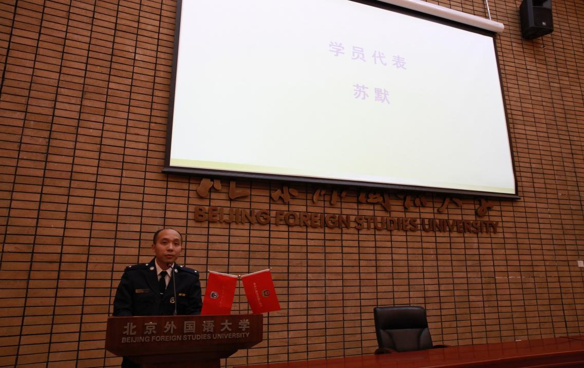 缅甸警官苏默通过积极申请第二次来到中国参加这个项目的学习。作为学员代表,作为一名中缅边境的执法人员,他在发言中用流利的汉语介绍了学习和生活经验,代表所有学员庄严承诺:在学期间,严格遵守中国法律法规,遵守校纪校规,刻苦学习,为促进全球警务合作做出贡献。