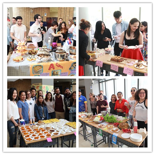 职工们热情高涨,精心设计了各班的宣传海报,烹制了各国的传统风味美食,比如法国含羞草蛋糕、俄罗斯可丽饼、保加利亚甜点、日本龙田炸鸡、缅甸椰奶果冻、孟加拉炸饺子、瑞典肉丸等,另外还有各种口味的饮品,比如西班牙果酒、百香果特饮、斯里兰卡红茶、日本和韩国的清酒、烧酒、法式调酒等,真是琳琅满目,色香味俱全。这里不仅是各种美食文化相互交流碰撞的市场,也是中外师生进行汉语交流的场所。展台后的职工用所学汉语跟“顾客”介绍菜名,宣传美味,甚至讨价还价,学以致用,兴致盎然。