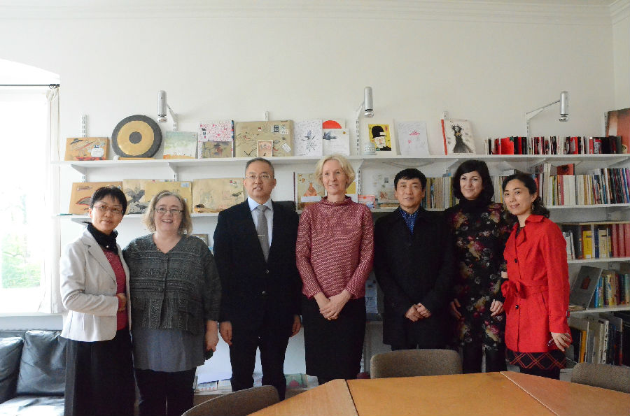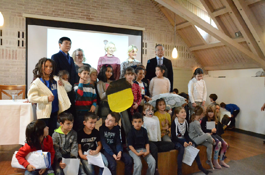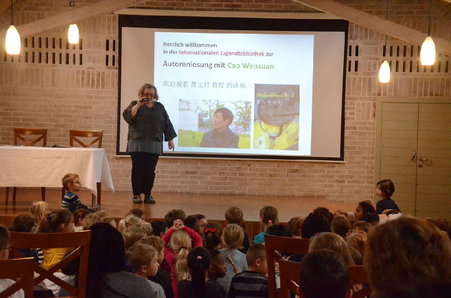 ....10月9日曹文轩先生与江苏凤凰少年儿童社社长王泳波等一行人抵达慕尼黑,在慕尼黑孔院的接待下参观了孔子公司,并展开了座谈交流。10月10日早上10时,曹文轩先生的互动读书会在国际青少年图书馆活动大厅拉开帷幕,由图书馆东亚馆负责人Obi女士主持。参加本次读书会是来自七所慕尼黑本地小学近两百名德国小读者,此外图书馆馆长Raabe女士作为组织方与江苏少儿出版社、慕尼黑孔院代表一同与会。为了拉近曹先生与小读者间的距离,该读书会采用了新颖的互动模式,由小读者们朗读德语版的《第八号街灯》,曹先生则用中文朗读这个故事,更独具创意的是其中一个小学的员工们以舞台剧的形式将故事中德情节表演出来了——他们自己动手设计了路灯及背景,并在老师的帮助上完成了服装和造型,比如有可爱的小狗、年老的爷爷奶奶及第八号路灯。这种独特的读书会受到了在场小读者的热烈欢迎,表演结束后,小读者们与曹先生进行了热切的问答交流,并共同合影,这也是一种中德少儿文学的碰撞与交流。会后,曹先生和王泳波社长将带来的中文版《第八号街灯》一书赠送给了舞台剧表演的小学。