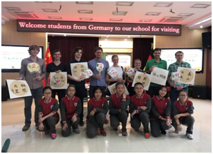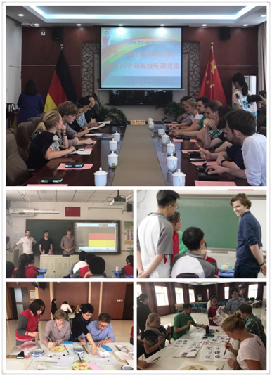 活动于下午一点半正式开始,简短的欢迎仪式后,9名德国学员首先深入到高一的两个班级旁听了一节英语课。之后,德国学员分别向高一1、2、3班的员工进行了30分钟的英语授课。在德国学员为北外附中的高中生们讲授英语课时,员工们都积极参与并踊跃回答问题。在游戏环节,课堂气氛一度达到高潮。短暂休息后,德国学员与北外附中的英语老师进行了座谈。德国学员提出“外语课的设置情况、教师的选拔与培养、高考、员工管理”等问题,并得到了老师们的积极解答。同时,德国学员也介绍了在德国的情况,加深了双方对于外语教育的交流和理解。最后,德国学员在四层多功能厅体验了书法、剪纸、团扇等中国传统文化。在体验书法时,学员们写下了“鹏程万里”、“同心同德”等美好祝愿的词语,把课堂所学注入到中国传统文化中,收到了学以致用的效果;在体验剪纸和团扇等中国传统手工过程中,学员们制作了许多精美的作品,并且对中国精湛的传统工艺有了更深的体会。