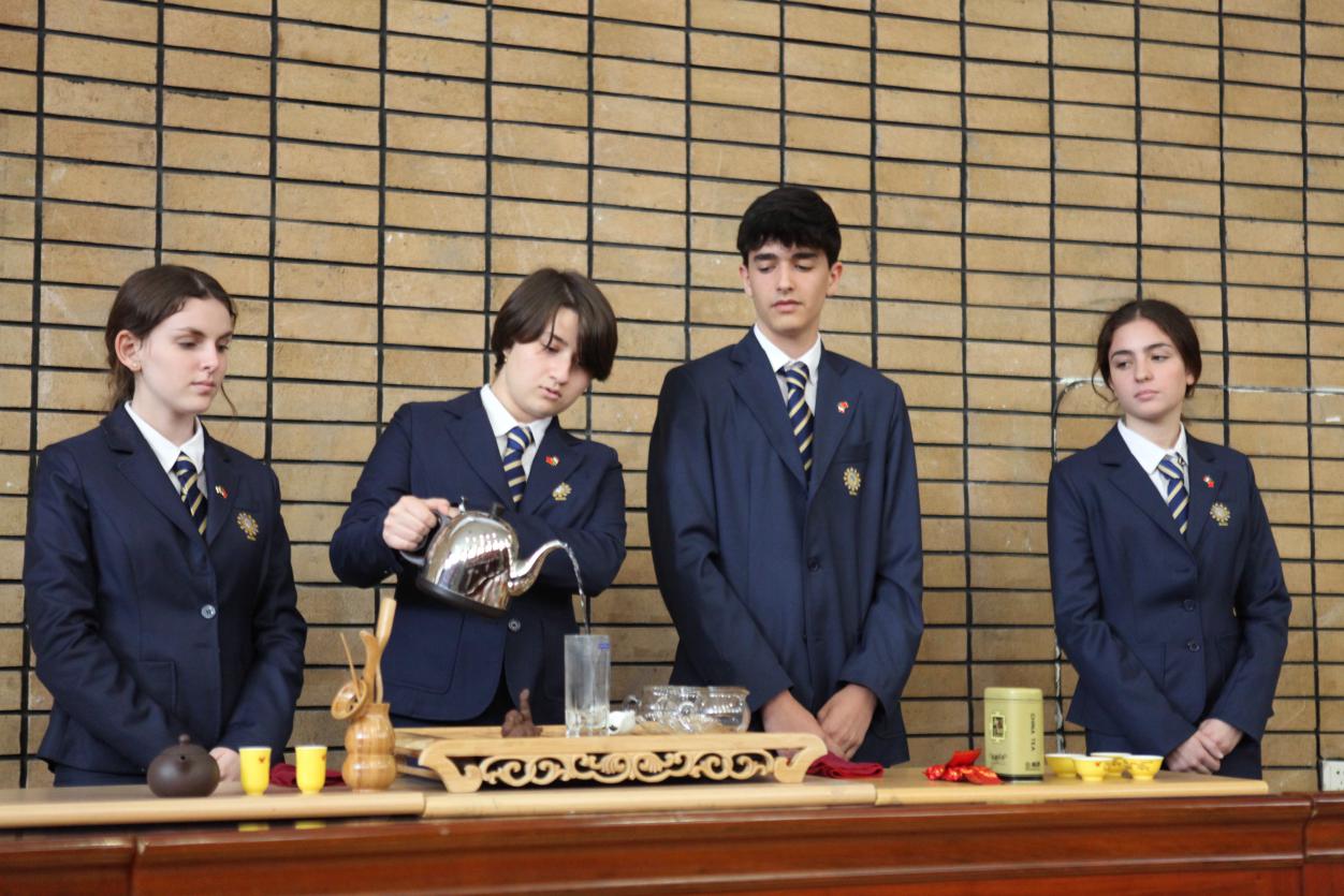 接着是高二年级茶艺展示,伴随着古筝曲《渔舟唱晚》,文化厅飘来阵阵茶香,罗马同学的泡茶技术娴熟,泡茶环节有条不紊的进行,以举一动都散发出端庄典雅的姿态,泡好茶后由员工端给张晓慧老师品茶。