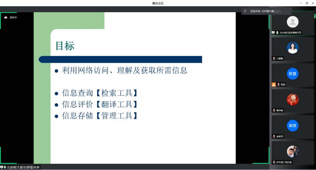 熊文新教授做了信息获取专题报告,详细介绍了搜寻指标相关资料的工具、方法思路,分类型、分环节地展示了信息搜集所涉及的资源库、网址浏览、外语翻译等相关工具,推荐了相关软件进行资料的汇总与整理,提倡信息共享写作,在团队内部互通有无、交流资源。