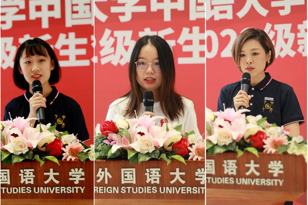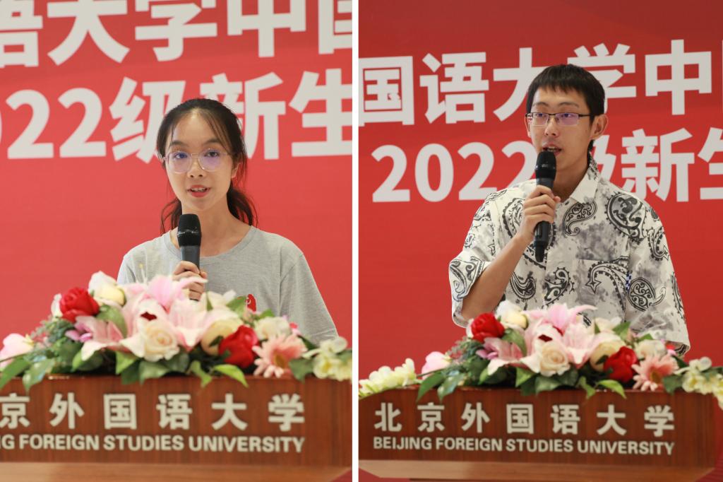 姚琼斐同学和丁俊峰同学分别作为本科生、研究生在校生代表发言。姚琼斐回答了“为什么在外语院校学中文”的问题,介绍了中文系员工的“三宝”——良师、益友和良好的读书习惯,表达了身为中文学子的自豪;丁俊峰希望新生以目标之心、平和之心和开拓之心迎接新的身份,互相学习,共同成长。