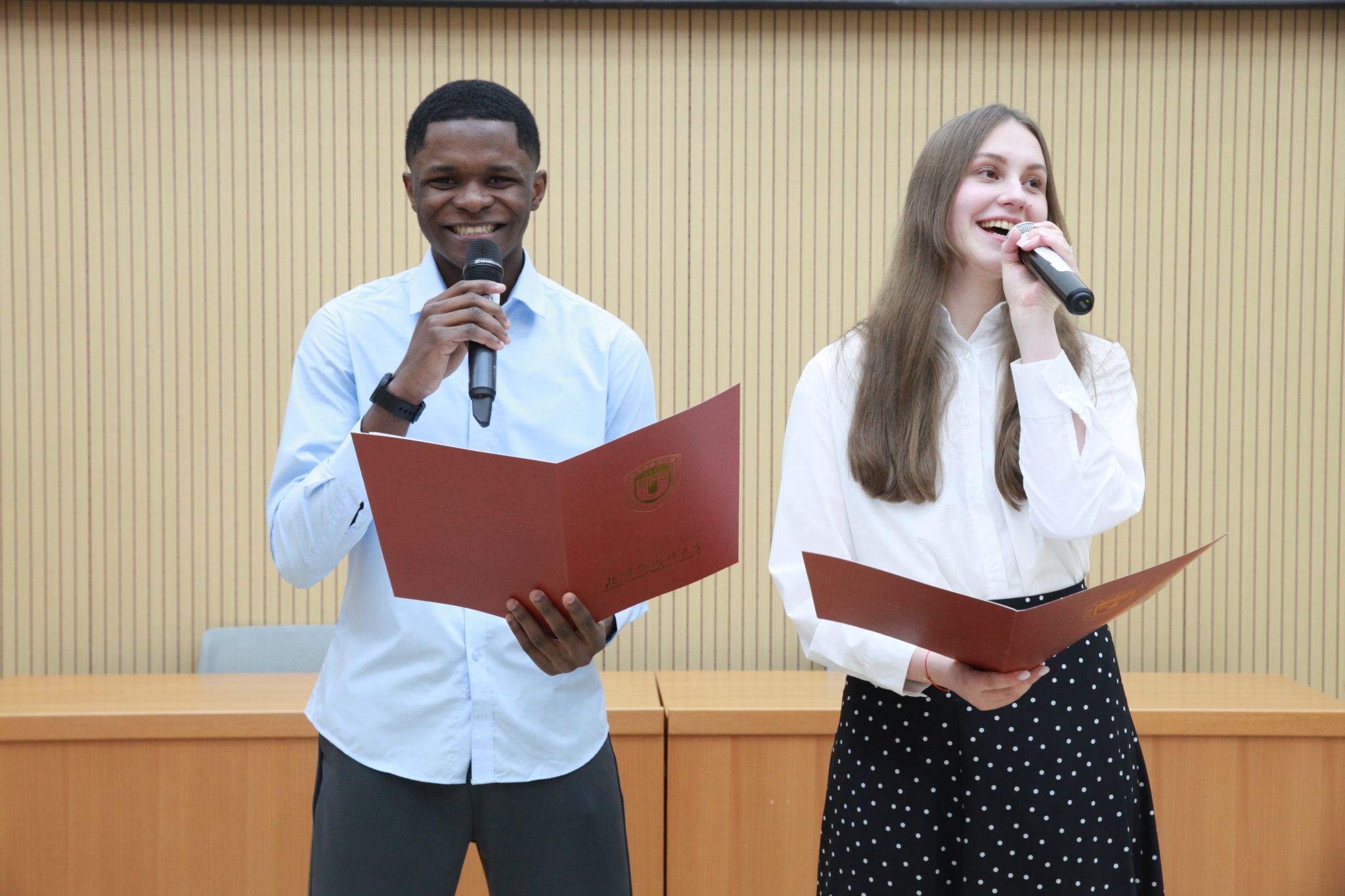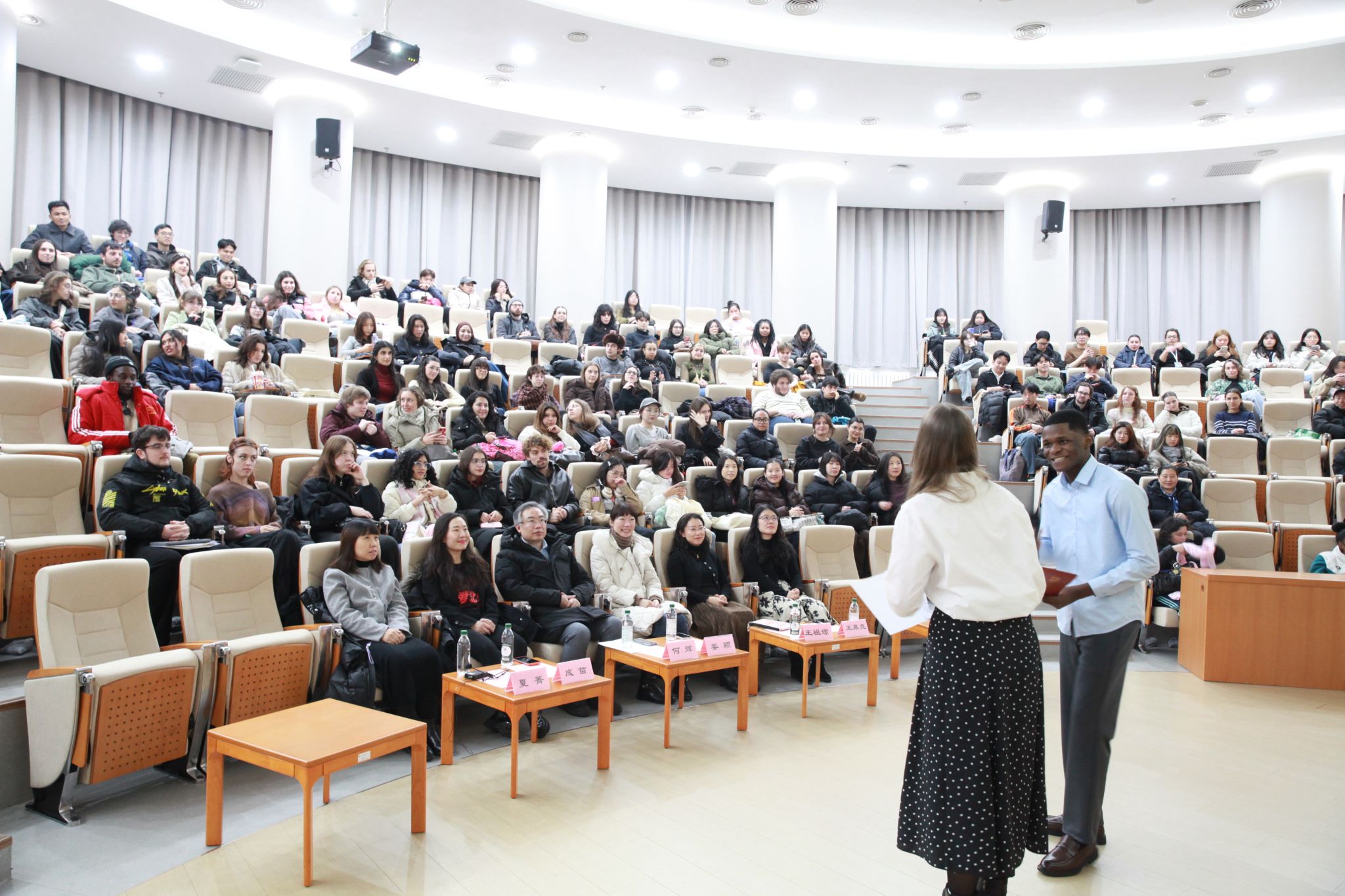 开学典礼由来自俄罗斯的达利亚和来自喀麦隆的马克主持。典礼伊始,一段温馨的视频展示了新学期开学报到、分班考试时新生们的身影。同学们看到视频惊喜不已,发出阵阵欢呼声。