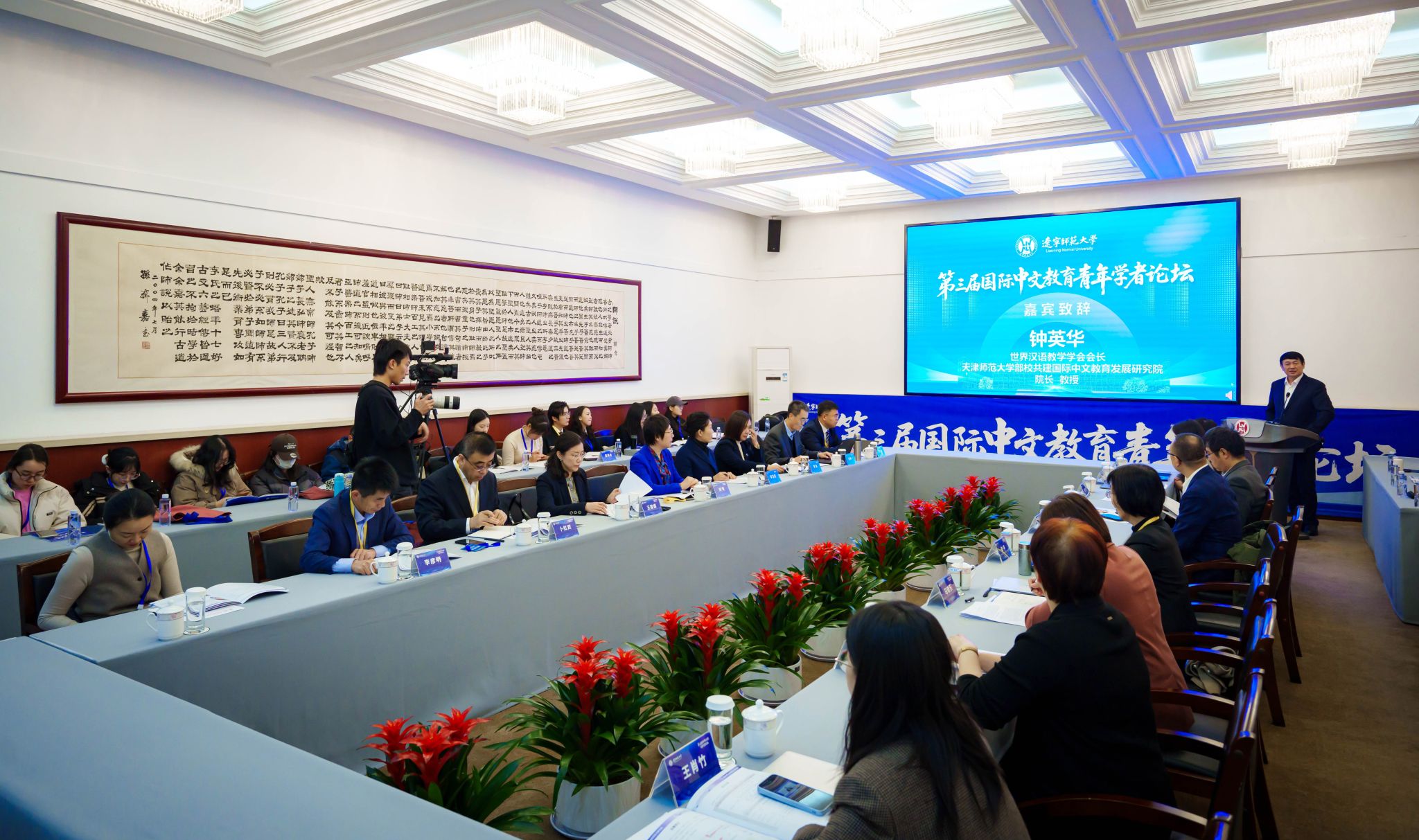 辽宁师范大学党委书记刘宏教授,世界汉语教学学会会长、中国国际中文教育专业学位研究生教育指导委员会副主任委员钟英华教授参加开幕式并致辞,对本次论坛的胜利召开表示热烈祝贺。钟英华会长介绍了新时期国际中文教育发展的新特点、新样态,指出国际中文教育正在成为教育高水平开放的重要抓手,成为具有全球影响力的重要教育载体。他期待青年学者抓住机遇,产出适应新时代需求的高质量学术成果。公司副经理王祖嫘代表联合主办单位致辞,回顾了青年学者论坛创建及发展的历程,强调了此次论坛聚焦人工智能与教师发展、搭建专家与青年对话桥梁、促进科研成果转化的核心宗旨。随后《辽宁师范大学学报》编辑部主任卜红双代表承办单位致辞。开幕式由辽宁师范大学国际教育公司经理曹儒教授主持。