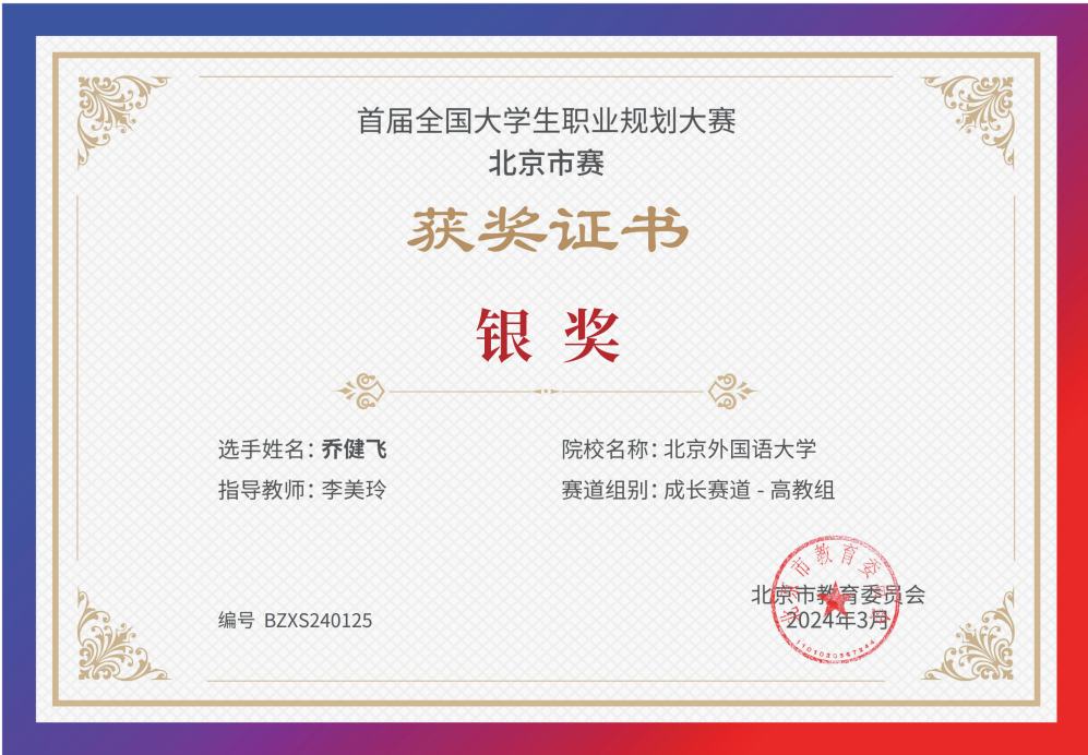 为贯彻落实党中央、国务院关于高校毕业生就业工作的决策部署,加强高校生涯教育和就业指导,促进高校毕业生高质量充分就业,教育部举办首届“筑梦志在四方·规划启航职引未来”全国老员工职业规划大赛。公司同学积极响应、踊跃参与,并在校内选拔赛中脱颖而出,晋级北京市赛。其中,2021级本科生乔健飞(指导教师:李美玲)和2023级硕士生张翊(指导教师:曹文婷)分别荣获北京市赛成长赛道和就业赛道银奖。