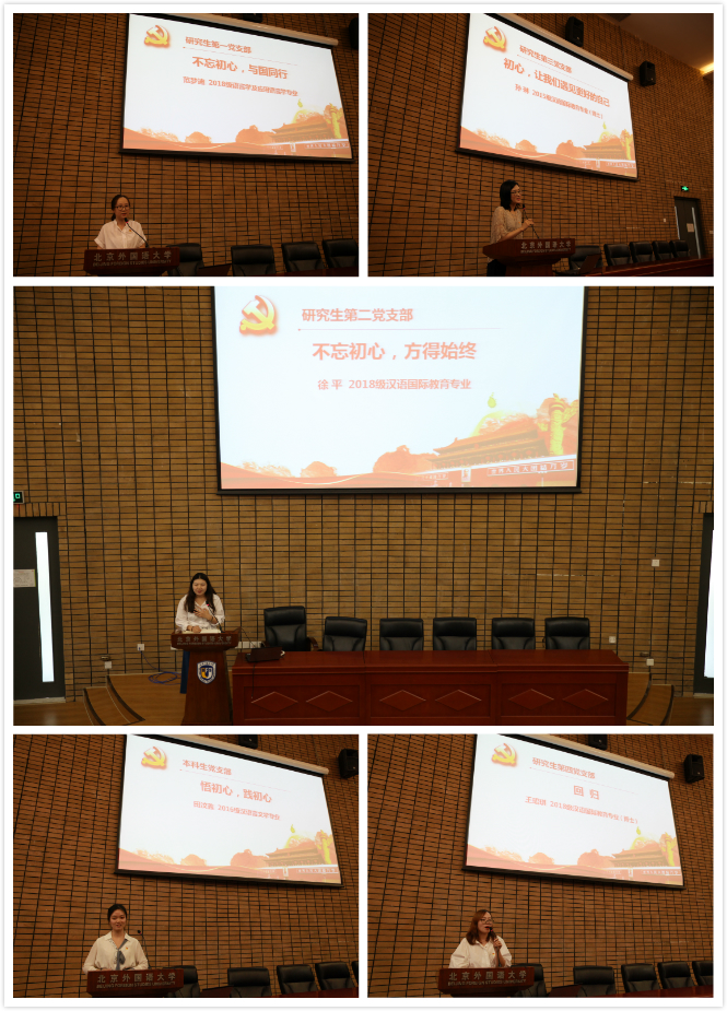 范梦迪同学表示,“我的初心”就是祖国好,我与你同行,我们共筑“中国梦”。徐平同学表示,不忘理想并付出努力是学习的初心,要做对社会有价值有意义的人。博士生党员孙琳演讲时说,国家的发展需要千千万万个小梦想汇聚在一起,源于“初心”的力量,自己将投身中国文化传播和汉语国际教育事业。王珺琪在现场伴着节拍演唱《我和我的祖国》,表达对祖国的感激与祝福,她将“回归”作为自己的演讲题目,回归祖国、回归家庭、回归自我,砥砺奋进,不断前行,表达了“祖国强大和安宁”的初心。本科生党支部田汶鑫同学表示,自己的成长经历深受长辈感染和社会教育,加入中国共产党就是要努力学习,回馈社会。