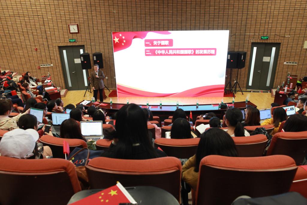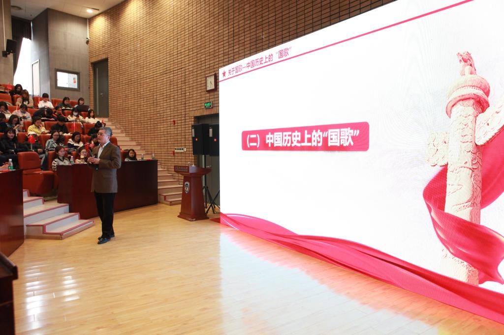 报告由《中华人民共和国国歌》的发展历程、国歌是国家神圣的象征、国歌承载厚重家国情怀、我们的国歌是世界上最好的国歌等几部分组成。于海老师指出,国旗、国徽和国歌是一个主权国家最重要的标志,国歌是国家的第一歌。我们的国歌是不屈不挠、团结奋斗民族精神的集中体现,历经时代变迁,在烽火中得到淬炼,为中国人民铭记与热爱。国歌是国家文化的结晶和历史见证,每个国家的国歌都凝聚着独特的文化内涵。国歌是公民爱国主义的载体,唱国歌和听国歌都能表达对民族和祖国的热爱。国歌具有崇高地位,受到法律保护。