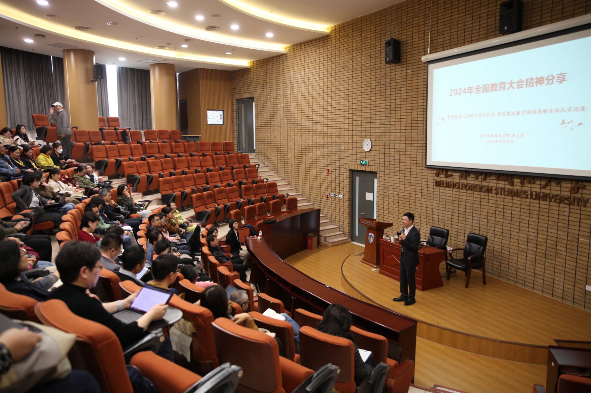 苑大勇从深刻把握教育强国的科学内涵、深入推动教育高水平对外开放、培养造就新时代高水平教师队伍三个维度回顾了大会重点内容。习近平总书记指出,我们要建成的教育强国,是中国特色社会主义教育强国,应当具有强大的思政引领力、人才竞争力、科技支撑力、民生保障力、社会协同力、国际影响力,为以中国式现代化全面推进强国建设、民族复兴伟业提供有力支撑。教育对外开放要统筹做好“引进来”和“走出去”两篇大文章,扩大国际学术交流和教育科研合作,积极参与全球教育治理。培养造就新时代高水平教师队伍,要实施教育家精神铸魂强师行动,加强师德师风建设,进一步完善中国特色教师教育体系,大力提高教师培养培训质量。最后,苑大勇对北外团队建设发展提出思考,指出要强化教育与科技、人才战略的协同发展,从个人和集体层面推动教育现代化和教育强国建设的实际措施。